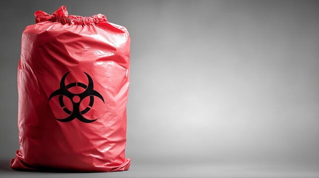 A red bag with a black and white symbol on it