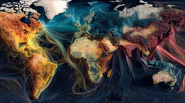 An abstract visualization showing a glowing interconnected global network spread across a dark background representing worldwide connections and potential pathogen dissemination