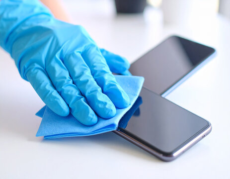 Cleaning Smartphone Screen with Blue Glove and Cloth on White Surface