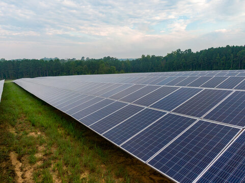 Morning Drone Images of a Large Renewable Solar Farm in Louisburg North Carolina Using Technology and Science for Green Energy & Lowering Carbon Footprints.