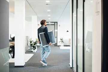 Businessman with solar panel walking at workplace