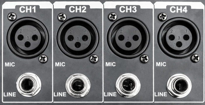 Power on and off electrical switch button and headphone input jack on a black amplifier