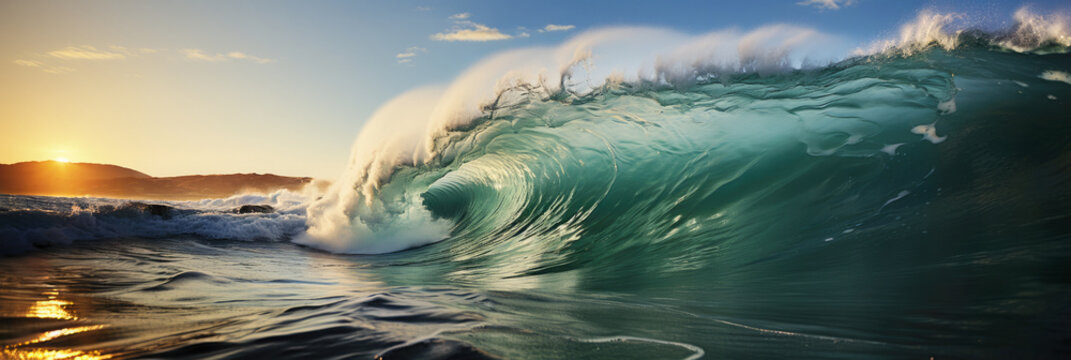 Panoramic seascape image of a powerful curling breaking wave, nature background HD wallpaper