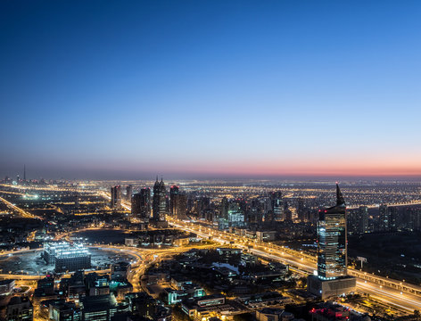 Dubai Business Bay at night with beautiful Towers and colorful reflections at night