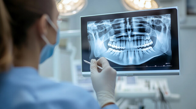Dental professional examining digital panoramic xray image of teeth jaw oral care scan tooth doctor