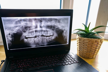 X-ray of teeth, complex dental case, on laptop