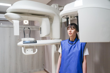 Young asian patient woman standing in dental x-ray machine for dental radiography.