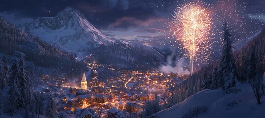 Winter Wonderland Fireworks Display Over Snow-Covered Mountain Town at Night