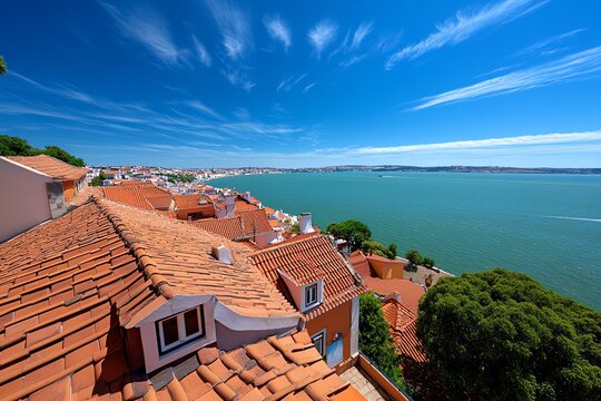 A panoramic view from Lisbon’s São Jorge Castle, overlooking the red rooftops and the Tagus River