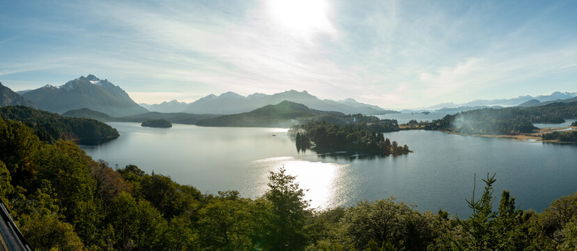 Scenic panoramic view of a serene lake with forest trees and blue sky