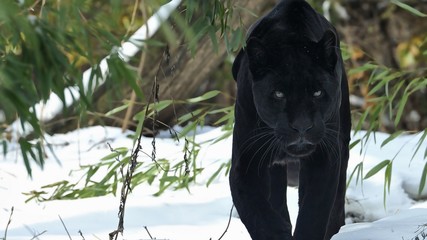Black panther surrounded by vegetation in attitude hunt. Panthera pardus