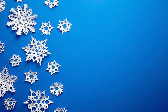 Composition with white paper snowflakes on blue background