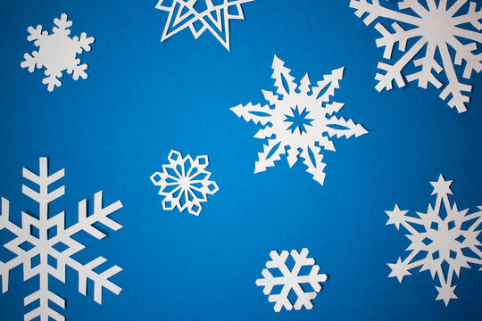 Composition with handmade paper snowflakes on blue background