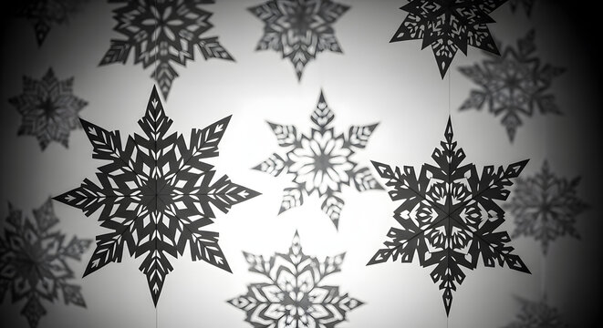 Beautiful paper snowflakes hanging in monochrome create a festive winter atmosphere, perfect for holiday promotions and cozy seasonal designs