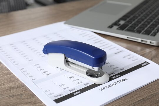 An orange stapler that sits on the desk ready for stapling the papers in a series of arrangements.