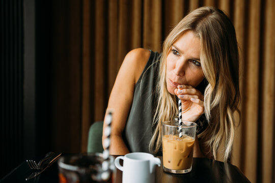 Woman drinking iced coffee through a paper straw at table