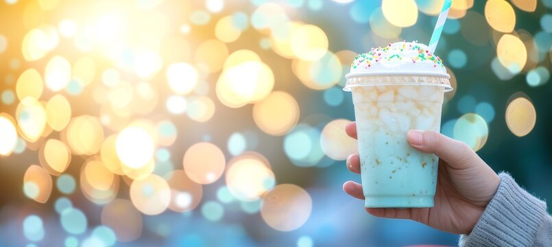Warm hot chocolate with marshmallows and straws on granite table