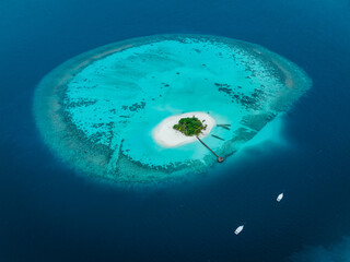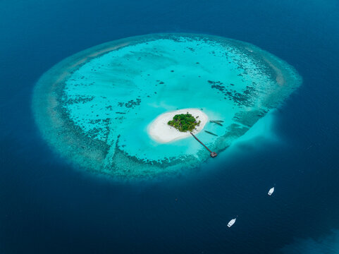 Aerial view of a small paradise island with sailing boats along the reef, Maldives archipelagos.