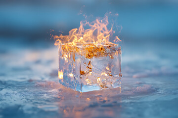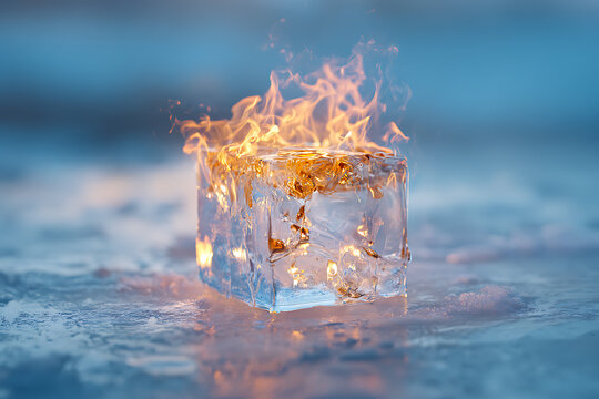 Discover the captivating contrast of fire dancing atop a melting ice cube, an eye catching balance of opposing forces, nature's thrilling paradox