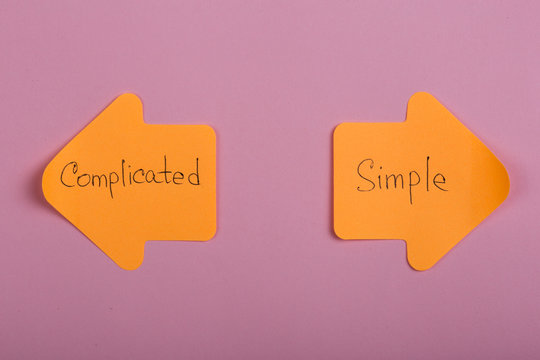 life choice - orange stickers in the form of index arrows with text Complicated and Simple on pink background