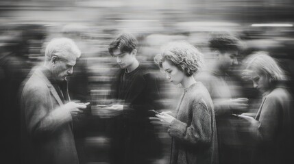 Connected but Alone: A monochrome photograph captures a poignant scene of individuals lost in their phones, symbolizing the modern paradox of connection and isolation in society.