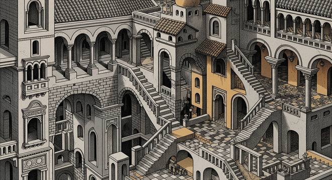 An intricate labyrinth of paradoxical stairways within a surreal and impossible architectural structure