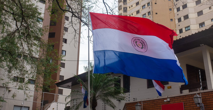 Paraguay flag waving on white background, close up, isolated with clipping path mask alpha channel transparency