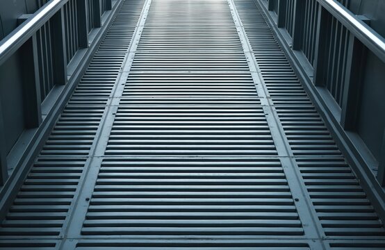 Upward view of long metal grate ramp on industrial footbridge. Steel walkway shows perspective with striped pattern. Architectural construction with strong lines leads towards light, providing safe