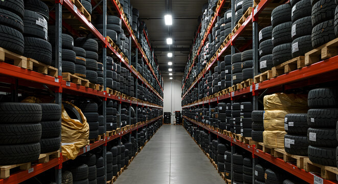 Warehouse Interior View Full of Stacks of New Black Tires on Red Racks and Wooden Pallets Storage with Gray Aisle and Organized System