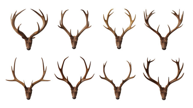 Two lines of antlers arranged symmetrically in parallel rows from wild animals isolated on white background