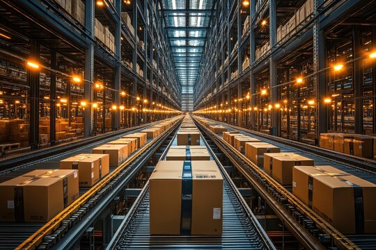 Automated Conveyor System Moving Cardboard Boxes in a Large Warehouse
