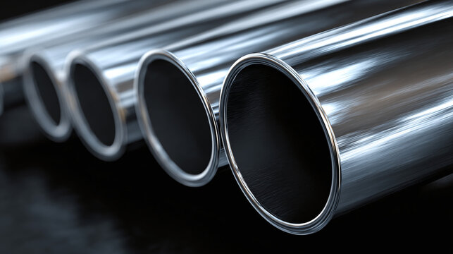 Shiny metallic pipes arranged in parallel lines reflecting light in a modern industrial setting with a sleek blue-toned background for manufacturing concept