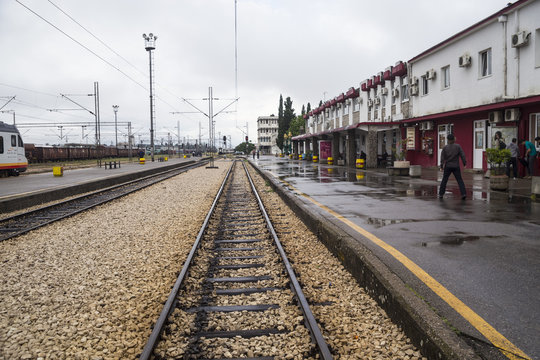 Moody cinematic railway tracks with raindrops converging toward mountains