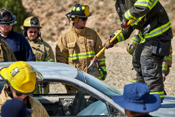 Side view of two paramedics in red uniforms on training for endotracheal intubation using medical dummy. Close - up