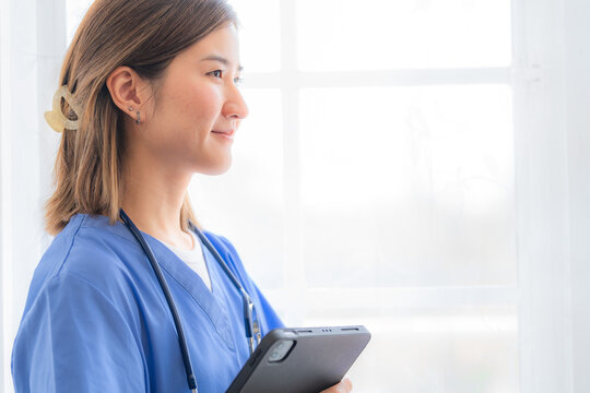 Asian Female medical assistant with smart tablet in white background. Portrait of mature female nurse working in hospital. Woman healthcare worker. Portrait of a good looking young nurse.