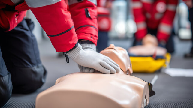A person performs CPR chest compressions on a during a training session, highlighting essential life-saving techniques and emergency preparedness.