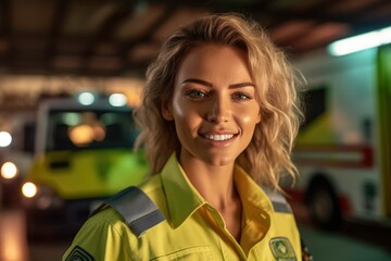 Portrait of a smiling female paramedic blurred background ambulance. Generated by AI