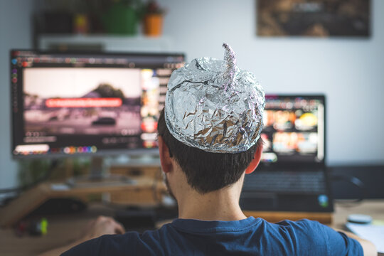 Conspiracy theory concept: young man is wearing aluminum head, sitting in front of the pc watching videos