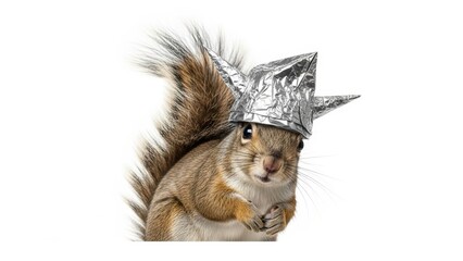 squirrel wearing a tinfoil hat, paranoid, paranoia, on a white background, animal photo