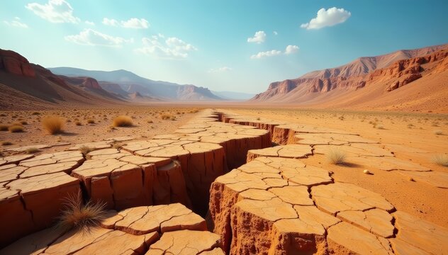 Barren land with parched soil and deep fissures in the ground, dry, desert