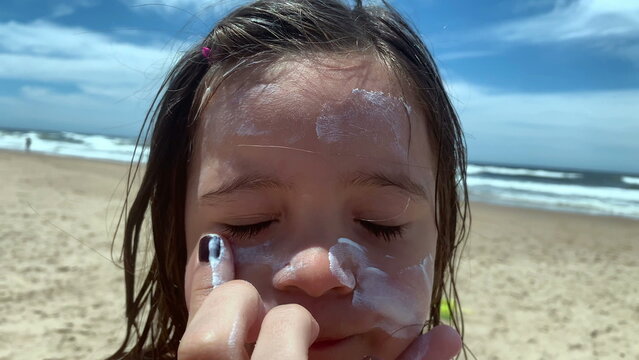 Parent applying sunscreen to daughter face. Mother rubbing and spreading sunblock to child