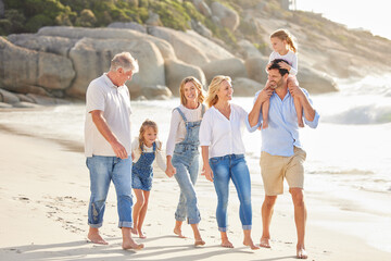 Beach, walking and children with parents and grandparents on summer vacation, adventure or holiday. Holding hands, love and family with generations by ocean for tropical weekend trip in Australia.