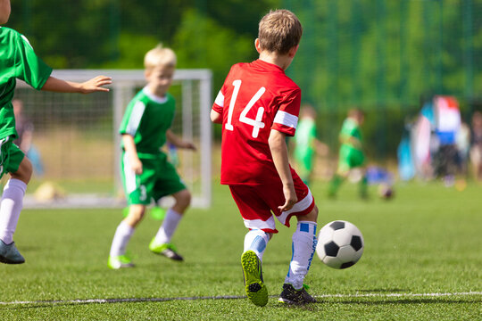 School children in soccer game. Football match for school kids. Young soccer player kicking ball towards goal. Children compete in soccer match