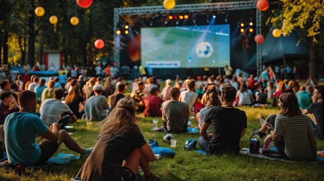 Football fans watching football in a public place at night