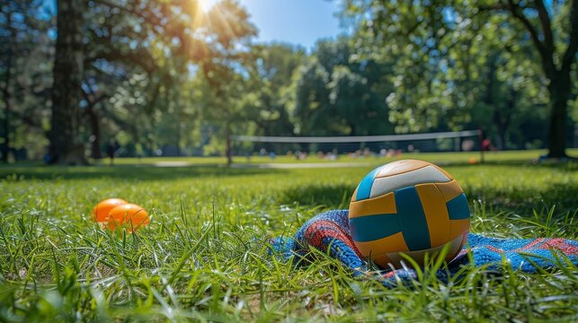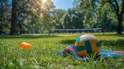 Colorful volleyball on a blanket in a sunny park with people playing in the background. Perfect image for outdoor and recreational themes.