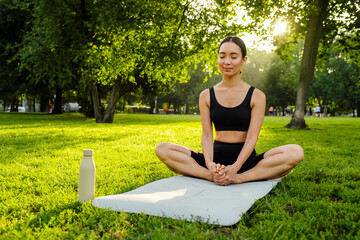 Young brunette asian woman practicing yoga during workout in park