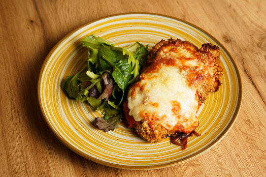 chicken parmigiana a breaded chicken schnitzel topped with tomato sauce and melted cheese often served with chips fries and a side salad