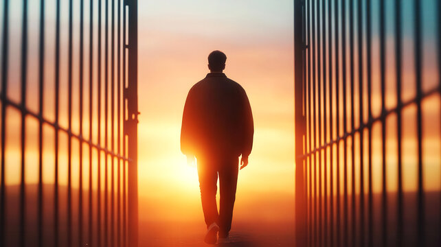 A silhouette of a man walking through an open gate at sunset, symbolizing freedom and new beginnings.