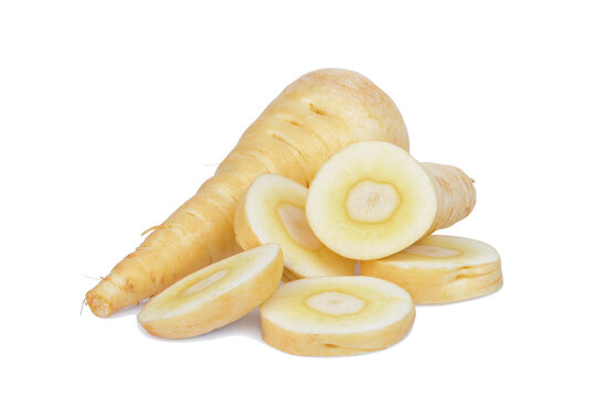 Parsnip root and slices with parsley peppercorns isolated on white background closeup. Top view. Flat lay
