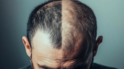 A man with a partial bald head looking down, showcasing hair thinning with a blurred background.